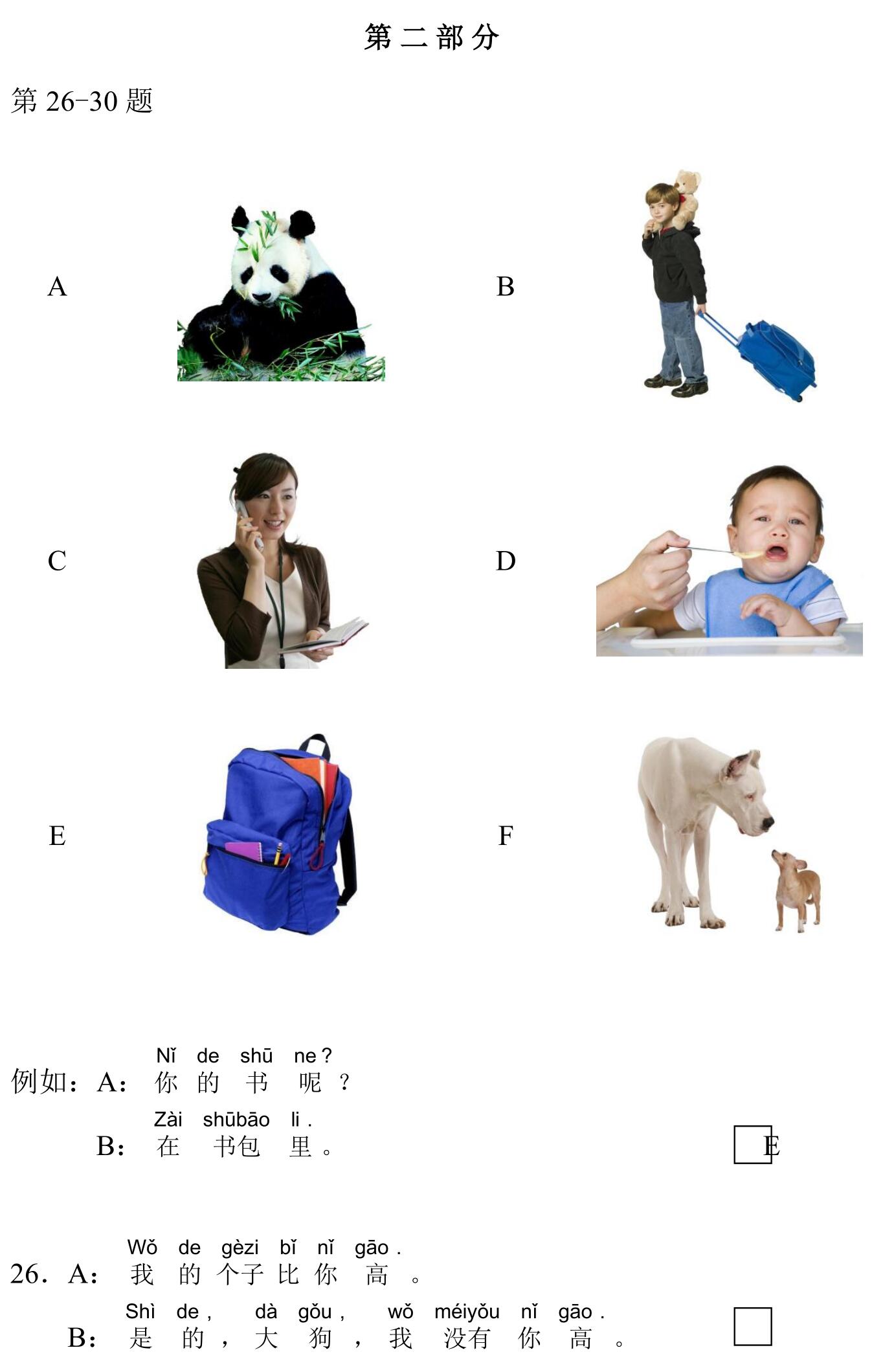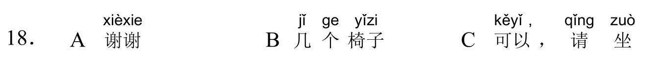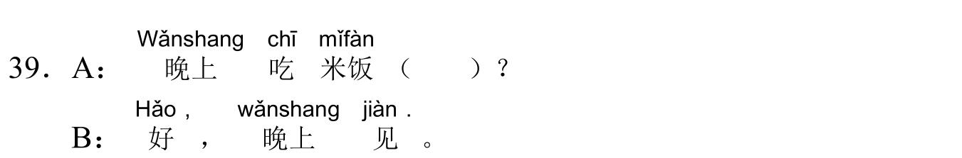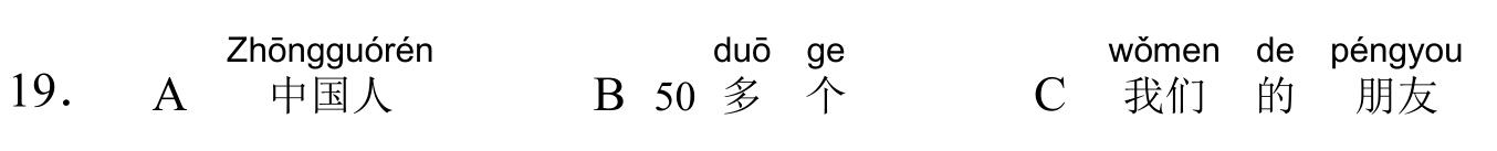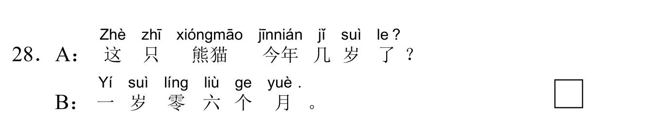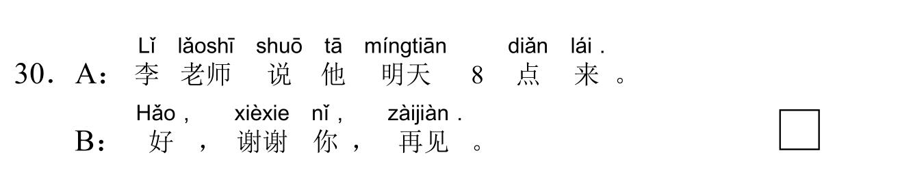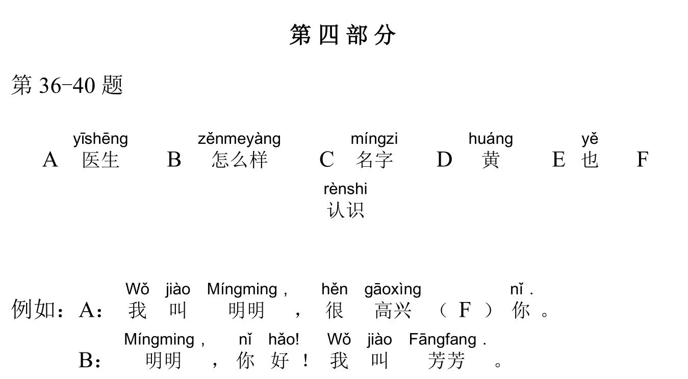 971 YCT 2 - Mock Test 1 Listening 1.听力(20 题,15分钟)After timer finished countdowning, test will be submitted automatically. True False 红苹果 True False 大耳朵 True False 二十八号 True False 很冷 True False 看书 A B C D E F 我现在去商店。 A B C D E F 看,铅笔在那儿,她的头发上。 A B C D E F 谁吃了我的香蕉? A B C D E F 睡觉了?那好,明天早上见。 A B C D E F 七点了,我要起床了。 A B C A:今天星期几?B:今天?今天星期三。 A B C A:那是你的吗?B:不是,那是我哥哥的。 A B C A:高兴吗?B:高兴,我喜欢在水里玩儿。 A B C A:这是谁的手?B:你说呢?妈妈。 A B C A:你好,你喝什么?B:谢谢,我喝茶。 A B C 明天天气热不热?A 不热B 真漂亮C 在里面 A B C 你爸爸呢?A 我认识B 我妹妹C 去学校了 A B C 我可以坐这儿吗?A 谢谢B 几个椅子C 可以,请坐 A B C 你们学校有多少中国学生?A 中国人B 五十多个C 我们的朋友 A B C 你姐姐会做面条儿吗?A 她不会B 很好吃C 买了四个包子 Your score is 0% Restart quiz 829 YCT 2 - Mock Test 1 Reading 2.阅读(20题,27分钟)After timer finished countdowning, test will be submitted automatically. True False True False True False True False True False A B C D E F A B C D E F A B C D E F A B C D E F A B C D E F A B C D E F A B C D E F A B C D E F A B C D E F A B C D E F A B C D E F A B C D E F A B C D E F A B C D E F A B C D E F Your score is 0% Restart quiz 3.8 23 votes How do you like it? Subscribe Login Notify of new follow-up comments new replies to my comments Label Name* Email* Label Name* Email* 8 Comments Newest Oldest Most Voted Inline Feedbacks View all comments Mia 5 months ago bruh …. i got all both correct ….100% hhahahah nirmit 11 months ago this hindi test was so easy Author hskcourse 11 months ago Reply to nirmit You can level up to HSK tests, which may be more suitable for you in difficulty. jean 11 months ago I could make a better one Jean 11 months ago I mean, it’s alright zhuliye 11 months ago 190 Load More Comments wpDiscuz