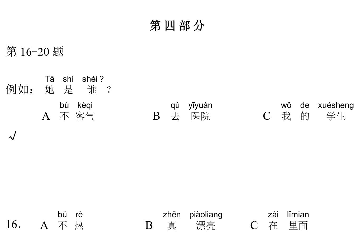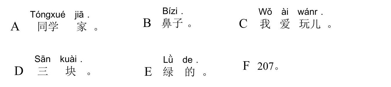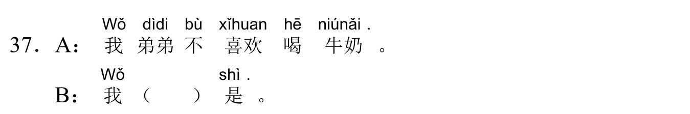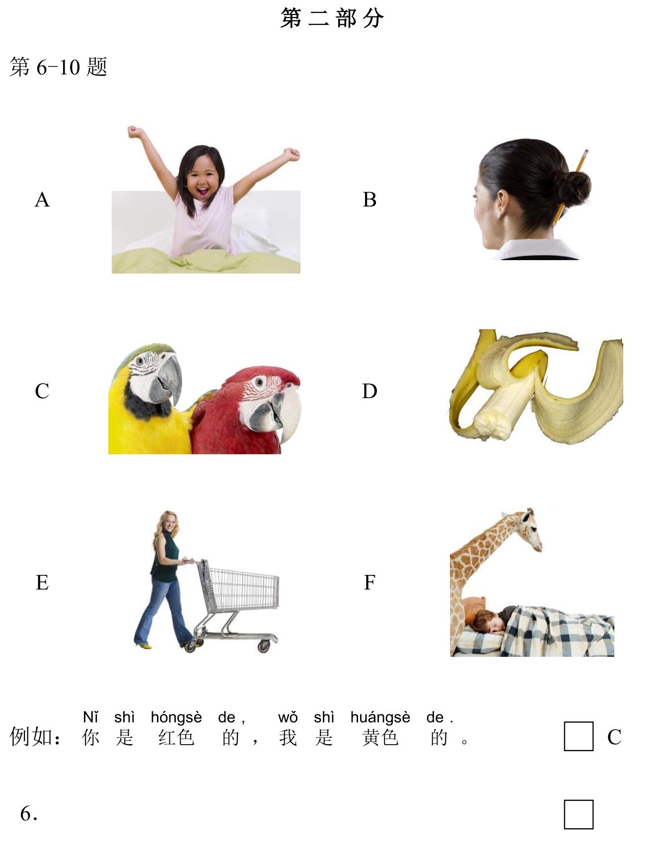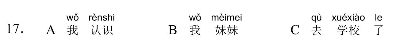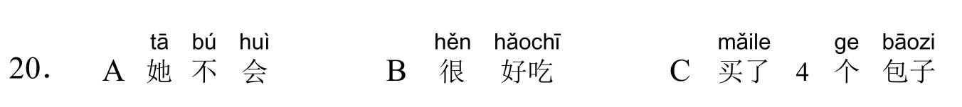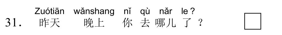 971 YCT 2 - Mock Test 1 Listening 1.听力(20 题,15分钟)After timer finished countdowning, test will be submitted automatically. True False 红苹果 True False 大耳朵 True False 二十八号 True False 很冷 True False 看书 A B C D E F 我现在去商店。 A B C D E F 看,铅笔在那儿,她的头发上。 A B C D E F 谁吃了我的香蕉? A B C D E F 睡觉了?那好,明天早上见。 A B C D E F 七点了,我要起床了。 A B C A:今天星期几?B:今天?今天星期三。 A B C A:那是你的吗?B:不是,那是我哥哥的。 A B C A:高兴吗?B:高兴,我喜欢在水里玩儿。 A B C A:这是谁的手?B:你说呢?妈妈。 A B C A:你好,你喝什么?B:谢谢,我喝茶。 A B C 明天天气热不热?A 不热B 真漂亮C 在里面 A B C 你爸爸呢?A 我认识B 我妹妹C 去学校了 A B C 我可以坐这儿吗?A 谢谢B 几个椅子C 可以,请坐 A B C 你们学校有多少中国学生?A 中国人B 五十多个C 我们的朋友 A B C 你姐姐会做面条儿吗?A 她不会B 很好吃C 买了四个包子 Your score is 0% Restart quiz 829 YCT 2 - Mock Test 1 Reading 2.阅读(20题,27分钟)After timer finished countdowning, test will be submitted automatically. True False True False True False True False True False A B C D E F A B C D E F A B C D E F A B C D E F A B C D E F A B C D E F A B C D E F A B C D E F A B C D E F A B C D E F A B C D E F A B C D E F A B C D E F A B C D E F A B C D E F Your score is 0% Restart quiz 3.8 23 votes How do you like it? Subscribe Login Notify of new follow-up comments new replies to my comments Label Name* Email* Label Name* Email* 8 Comments Newest Oldest Most Voted Inline Feedbacks View all comments Mia 5 months ago bruh …. i got all both correct ….100% hhahahah nirmit 11 months ago this hindi test was so easy Author hskcourse 11 months ago Reply to nirmit You can level up to HSK tests, which may be more suitable for you in difficulty. jean 11 months ago I could make a better one Jean 11 months ago I mean, it’s alright zhuliye 11 months ago 190 Load More Comments wpDiscuz